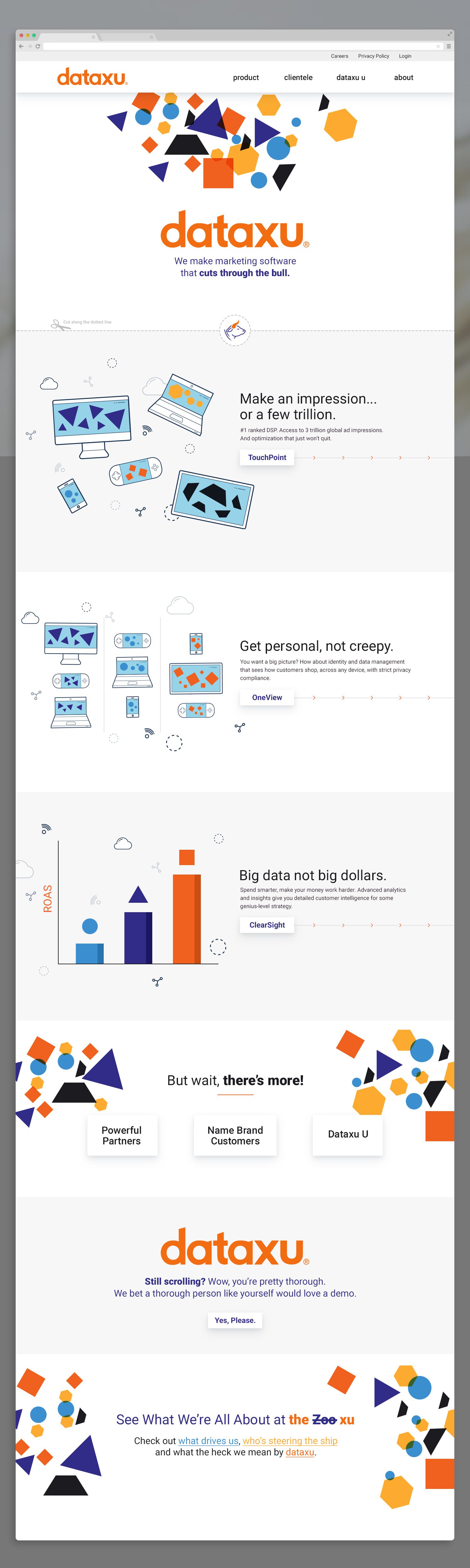 Dataxu was looking to use their new branding to its fullest potential and reached out for a fresh new homepage implementation. With new, bold copy, I designed an overly simplified version of the homepage that explained their complicated ad buying products using different shapes flowing through their different products.