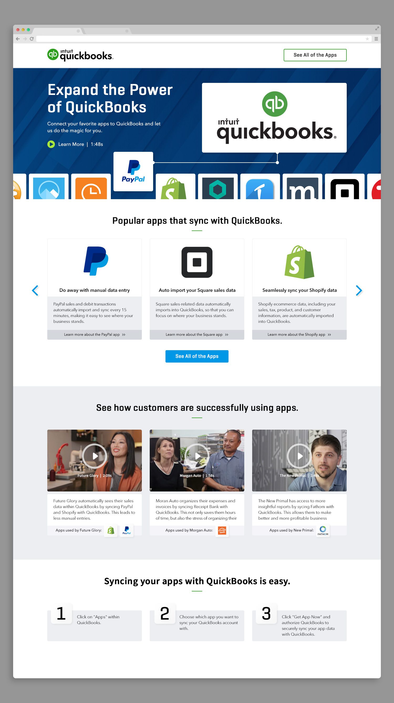 Intuit needed a landing page as well as an ad campaign that explained how their apps connected to QuickBooks. We kept the landing page simple with graphical elements and testimonials while we focused on small business owners somewhat breaking out of the box to use QuickBooks Apps.