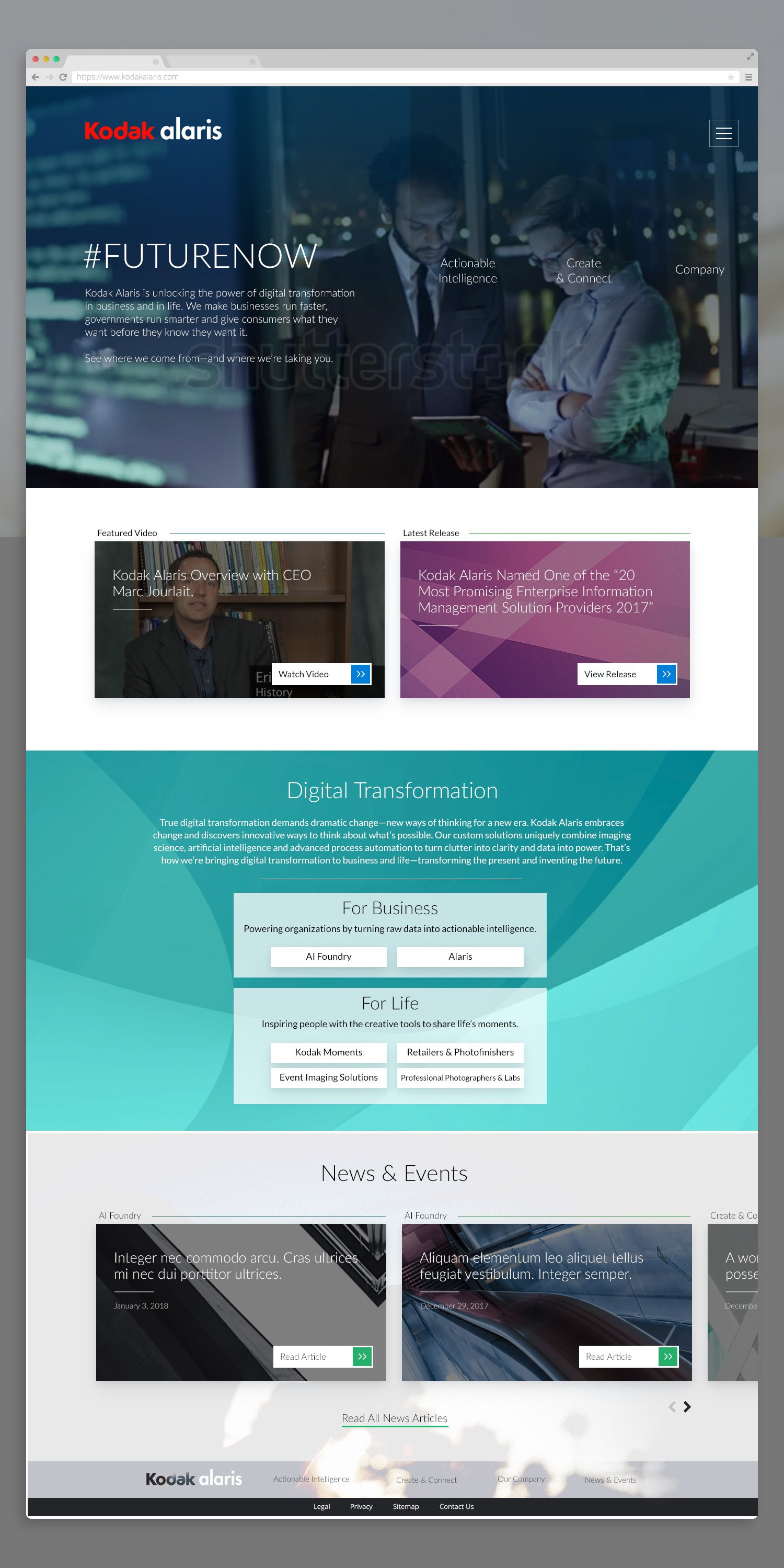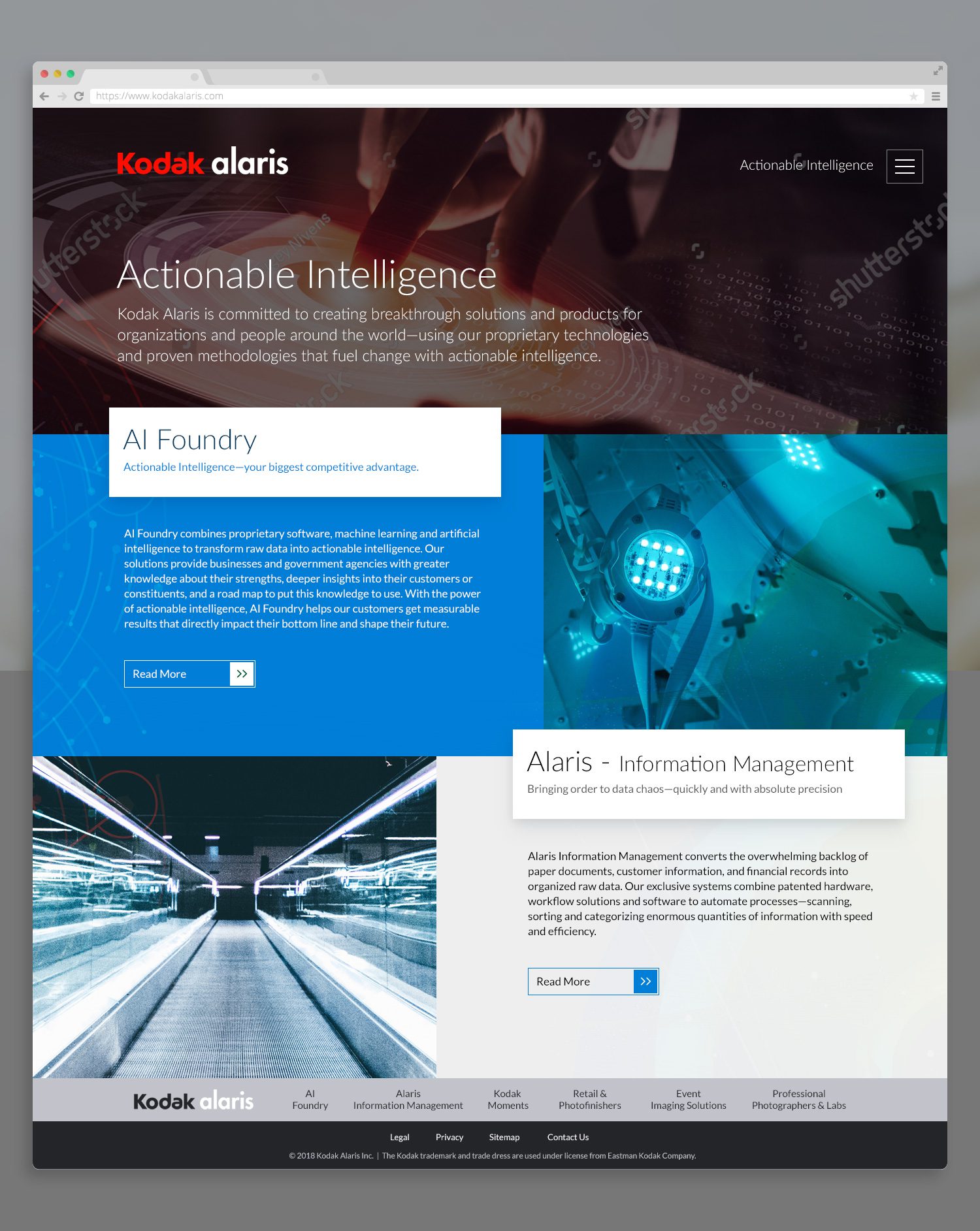 Kodak Alaris is in the middle of redesigning not only their visual brand but their entire brand narrative. They want to be known as a very ‘tech-savvy’ company on the leading edge of AI. I designed their new look to reflect this using lots of gradients and technology-based abstract elements along with clean white elements to offset the controlled chaos of some of the visual elements.