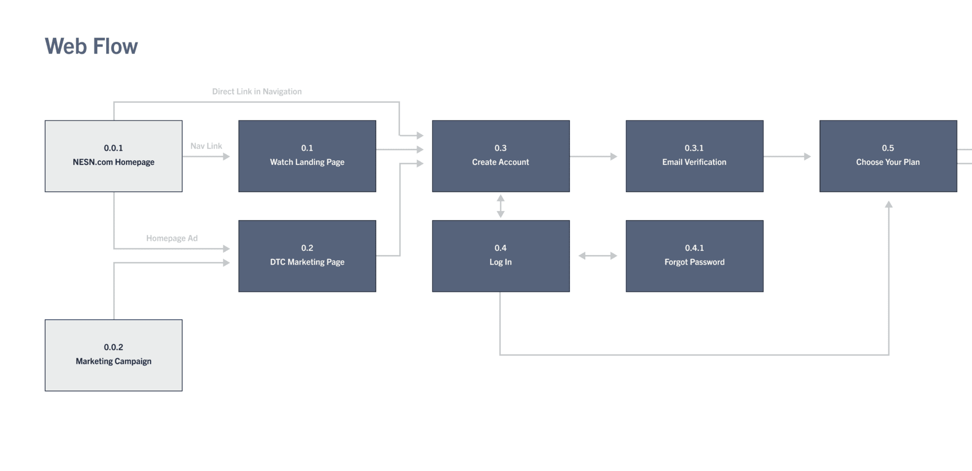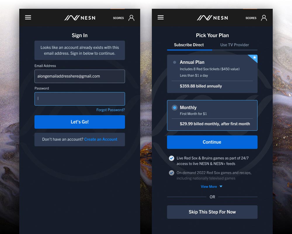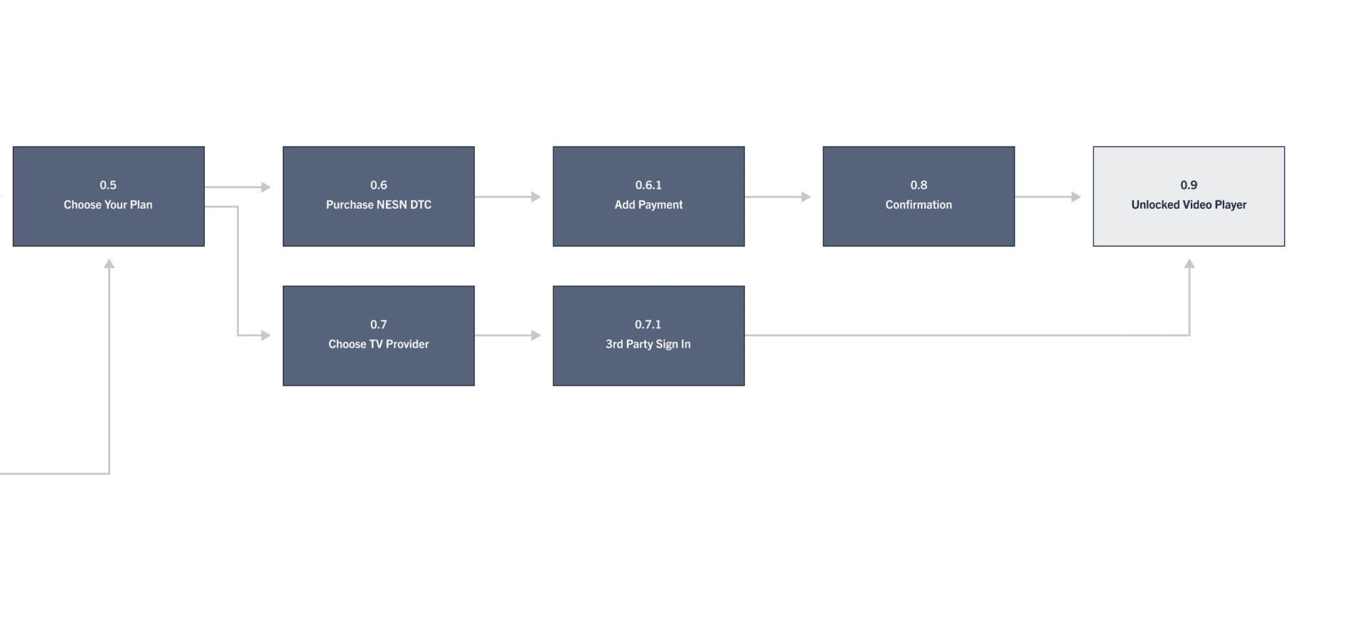 As we were the first RSN in the country to launch a DTC streaming option (NESN 360) to its fans, we needed a seamless onboarding flow to get the users to subscribe to the offering. I worked with Sales, Marketing, UX Research, and Upper Management very closely to complete this project.
