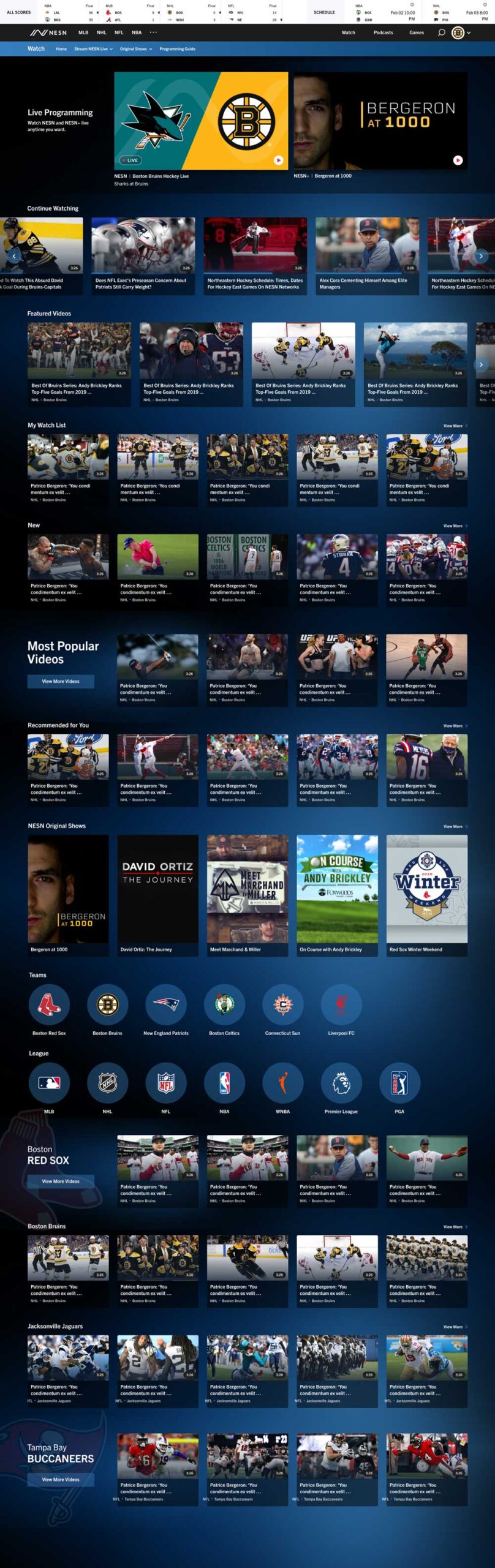 The two live streams (NESN and NESN+) were the main draw to this service. All of our video content was broken up into categories (MLB, NHL, NFL, NBA, Boston Red Sox, Boston Bruins, etc.). I originally had goals to hook everything into BlueConic (a CDP) to track everyone’s viewing behavior and serve up relevant content. Unfortunately, the vendor we worked with to build out my designs fell well short of all of our expectations.