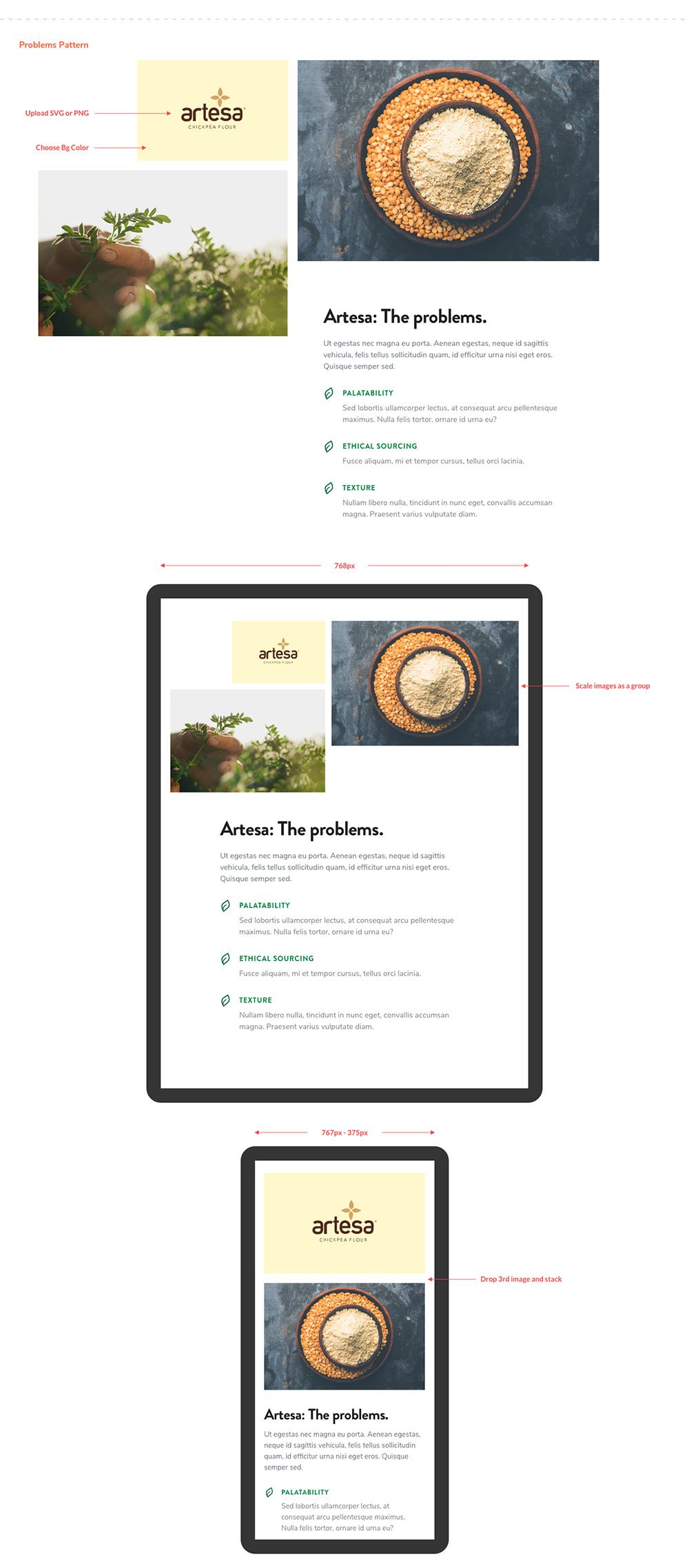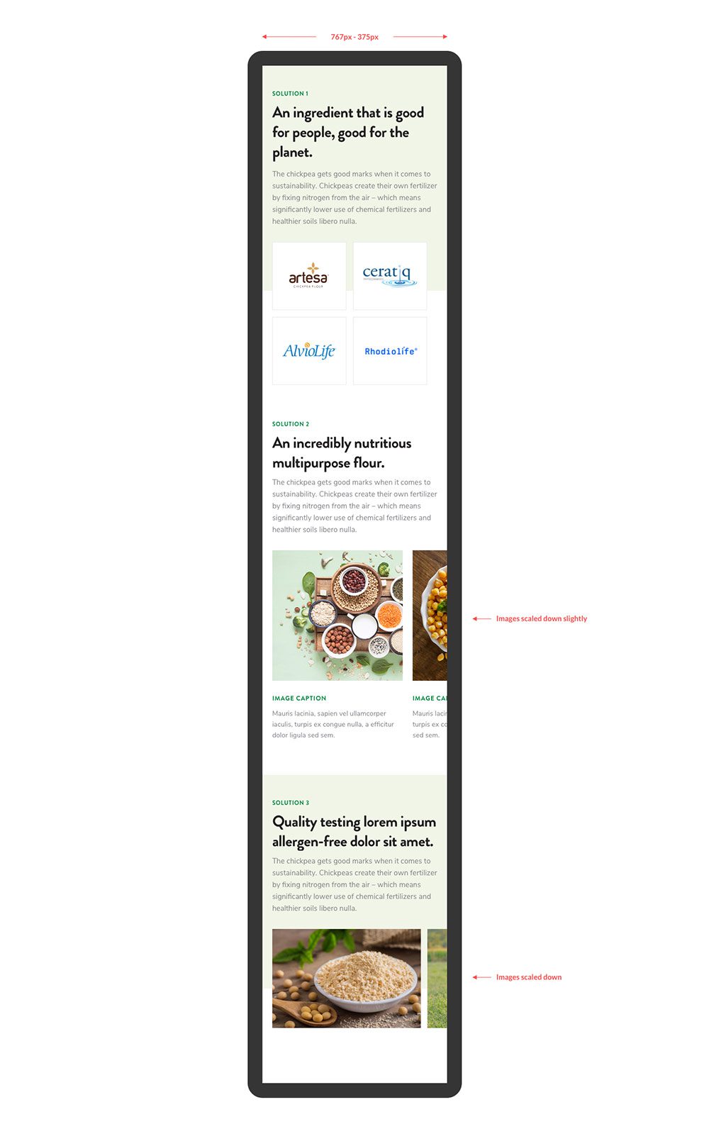 Screenshots include the homepage, custom icons, and an example of instructions for the dev on how to break down a page from desktop to mobile.