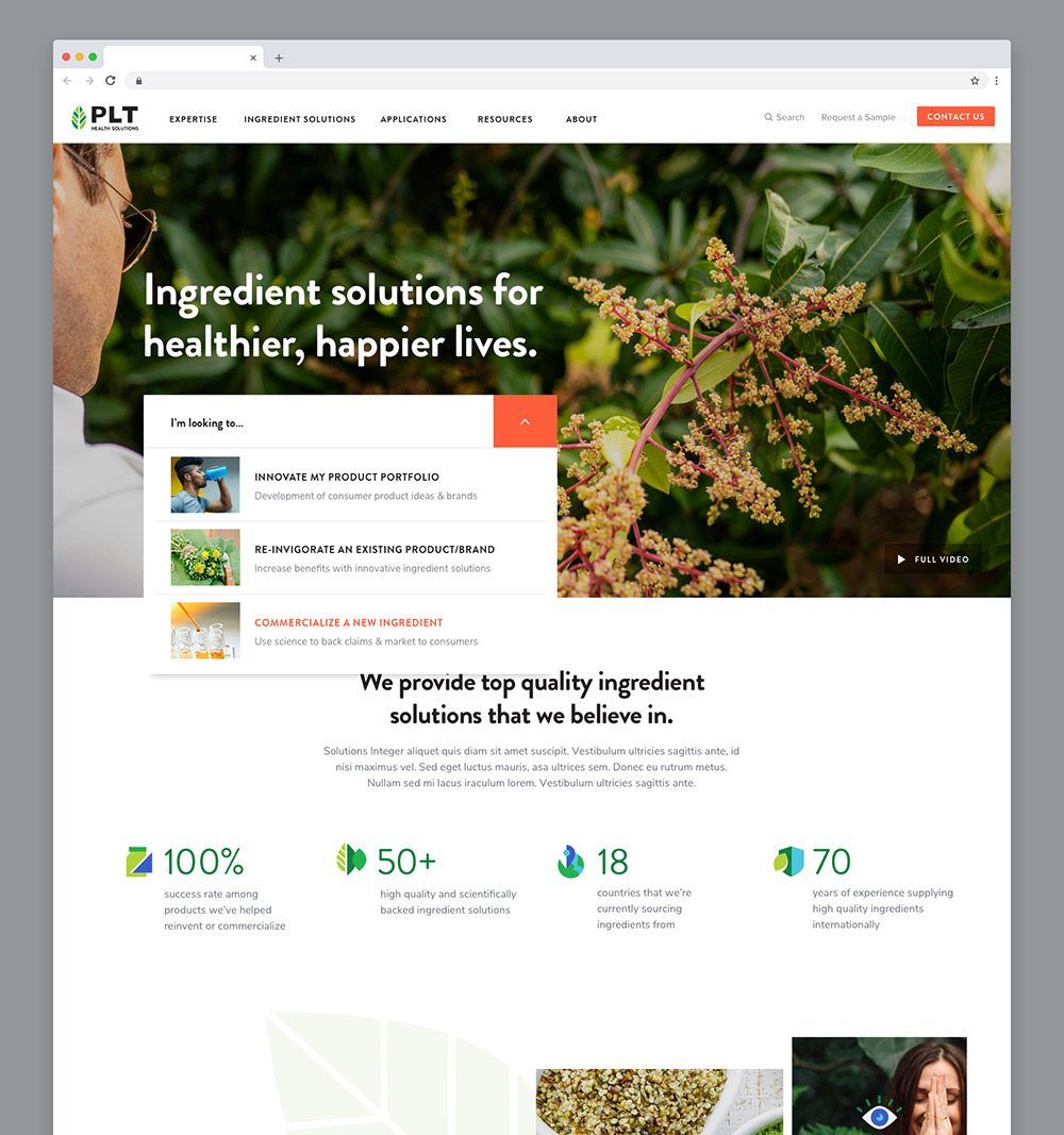 PLT was another large web build that included hundreds of products and ingredients. They wanted a clean site that showed off their stunning photography, fun, simplistic iconography, and subtle animation throughout.