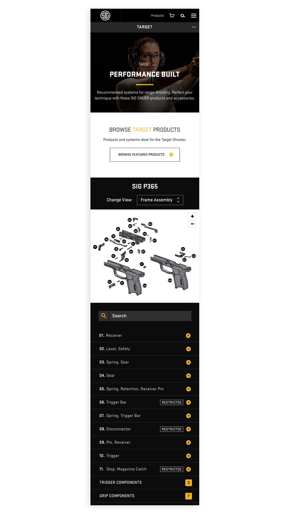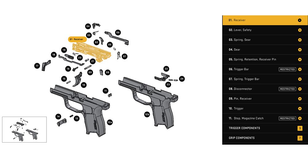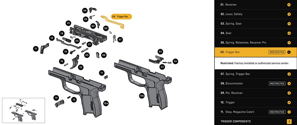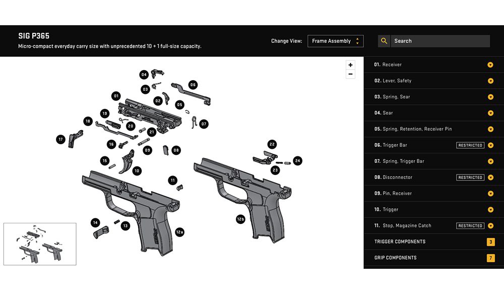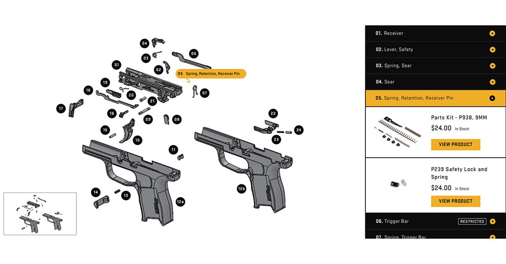 Sig Sauer needed an interface to show schematics of each of their handguns. In this interface, you could either hover over specific parts in the illustration or look at the names of the parts on the right-hand side. Clicking on any part would show you the specific part’s name and give you information on purchasing.