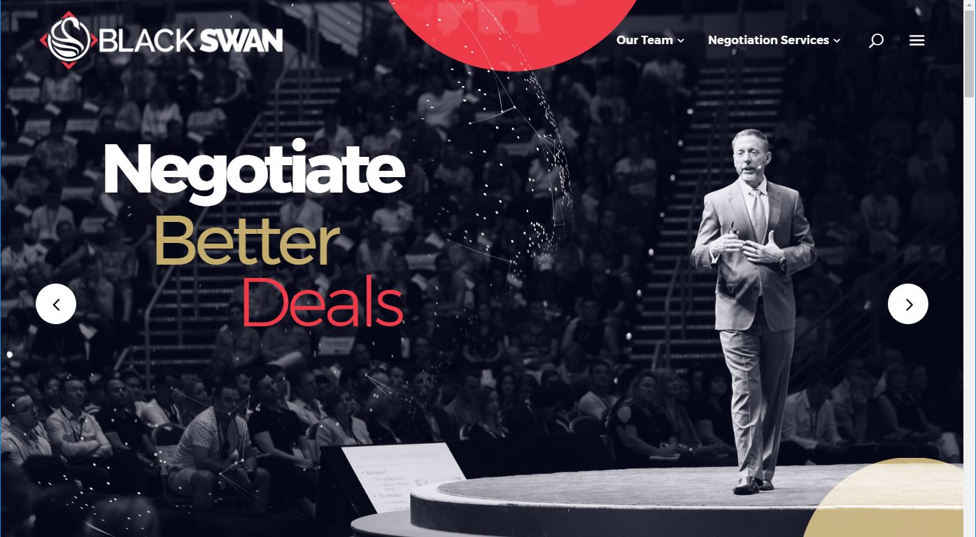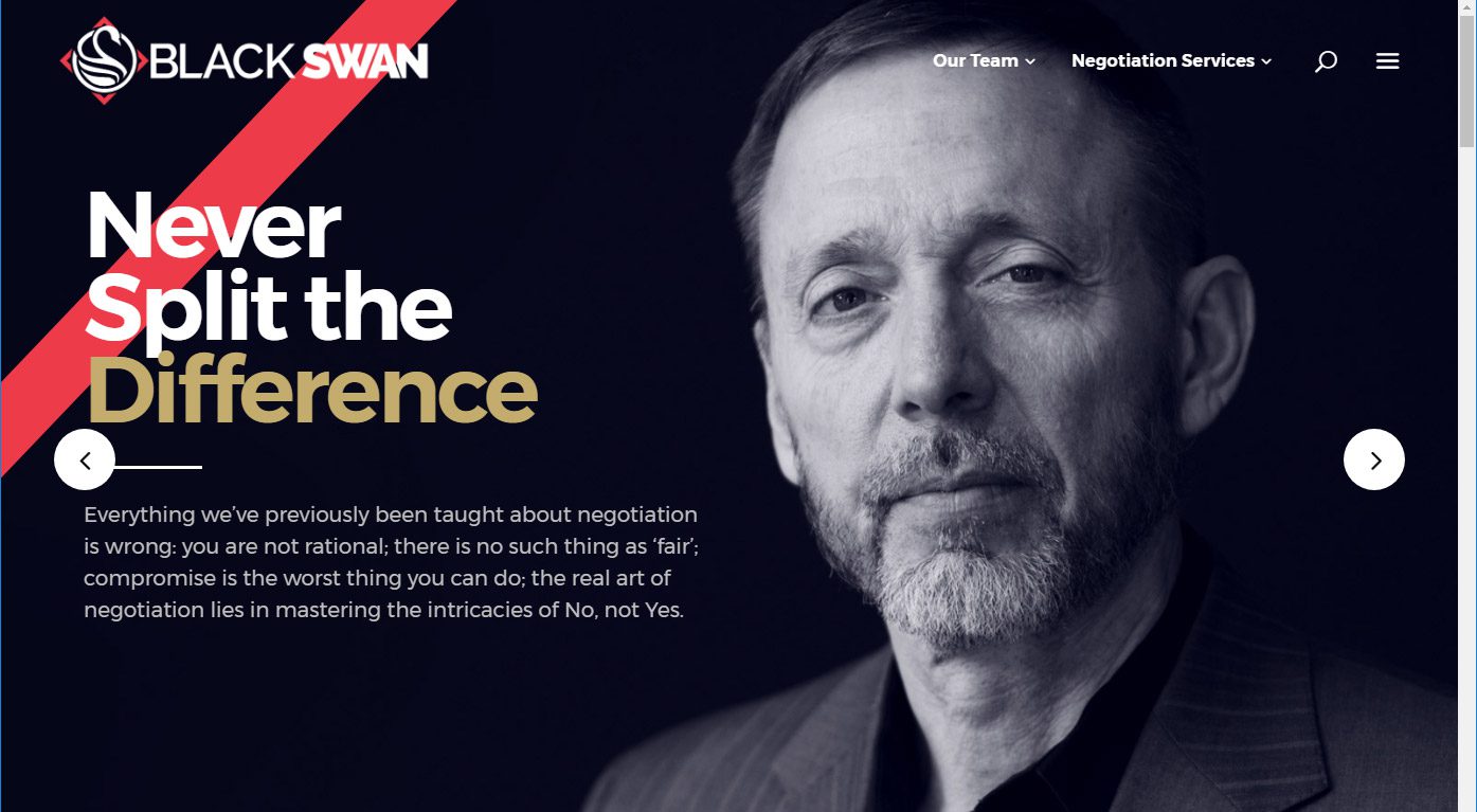 The Black Swan Group. led by former FBI hostage negotiator, Chris Voss teaches businesses communication through negotiation skills. They wanted a professional, strong brand and website. The final logo used all capital letters to show strength while the icon was a mix of a badge and a swan to show of their authority and their namesake.