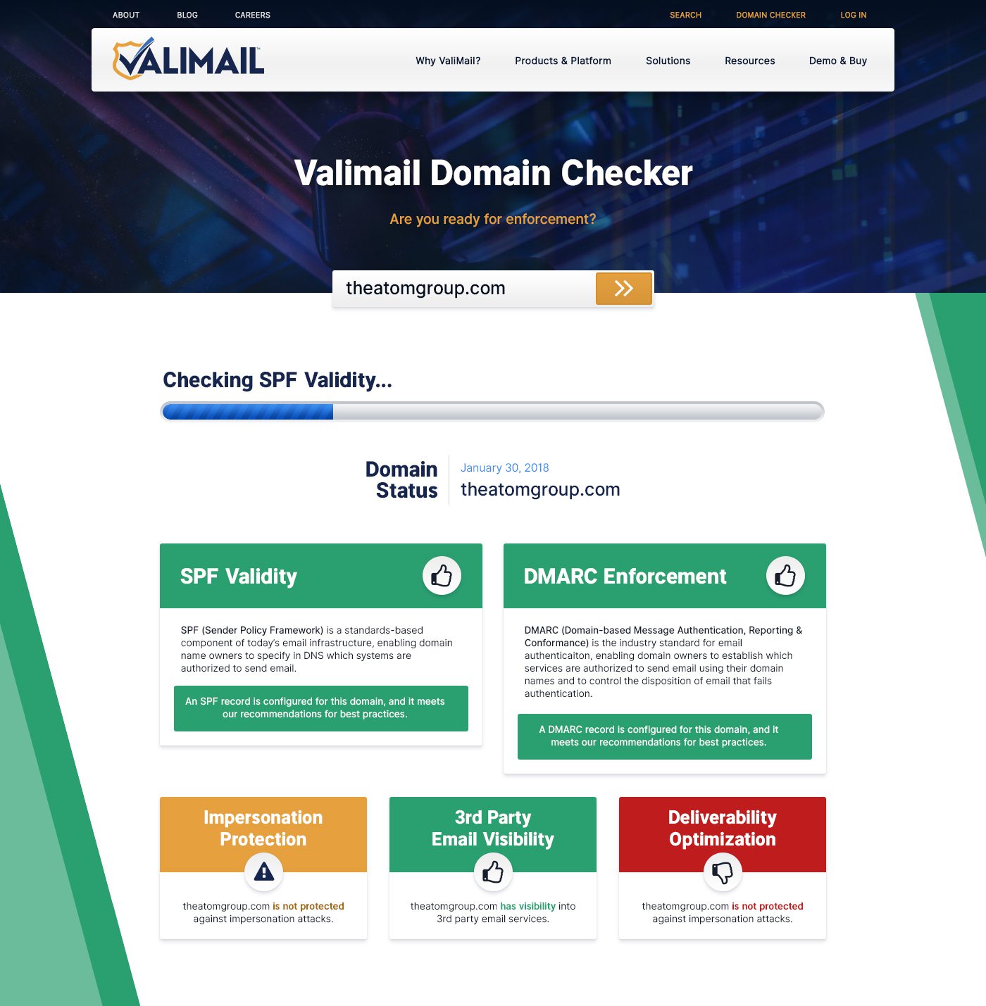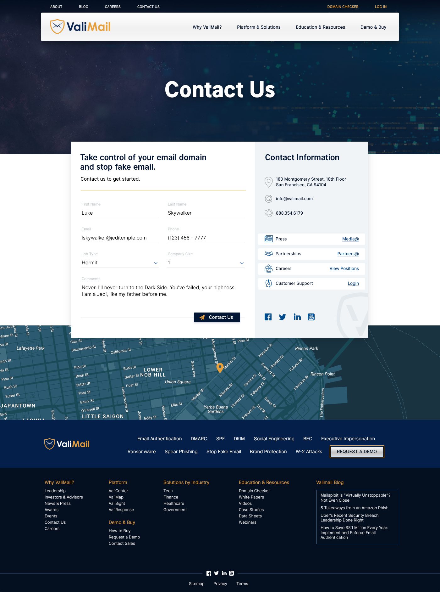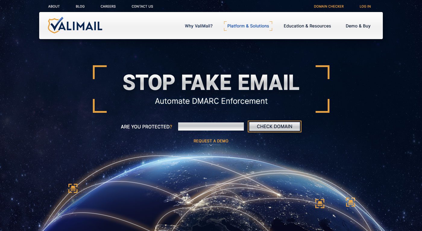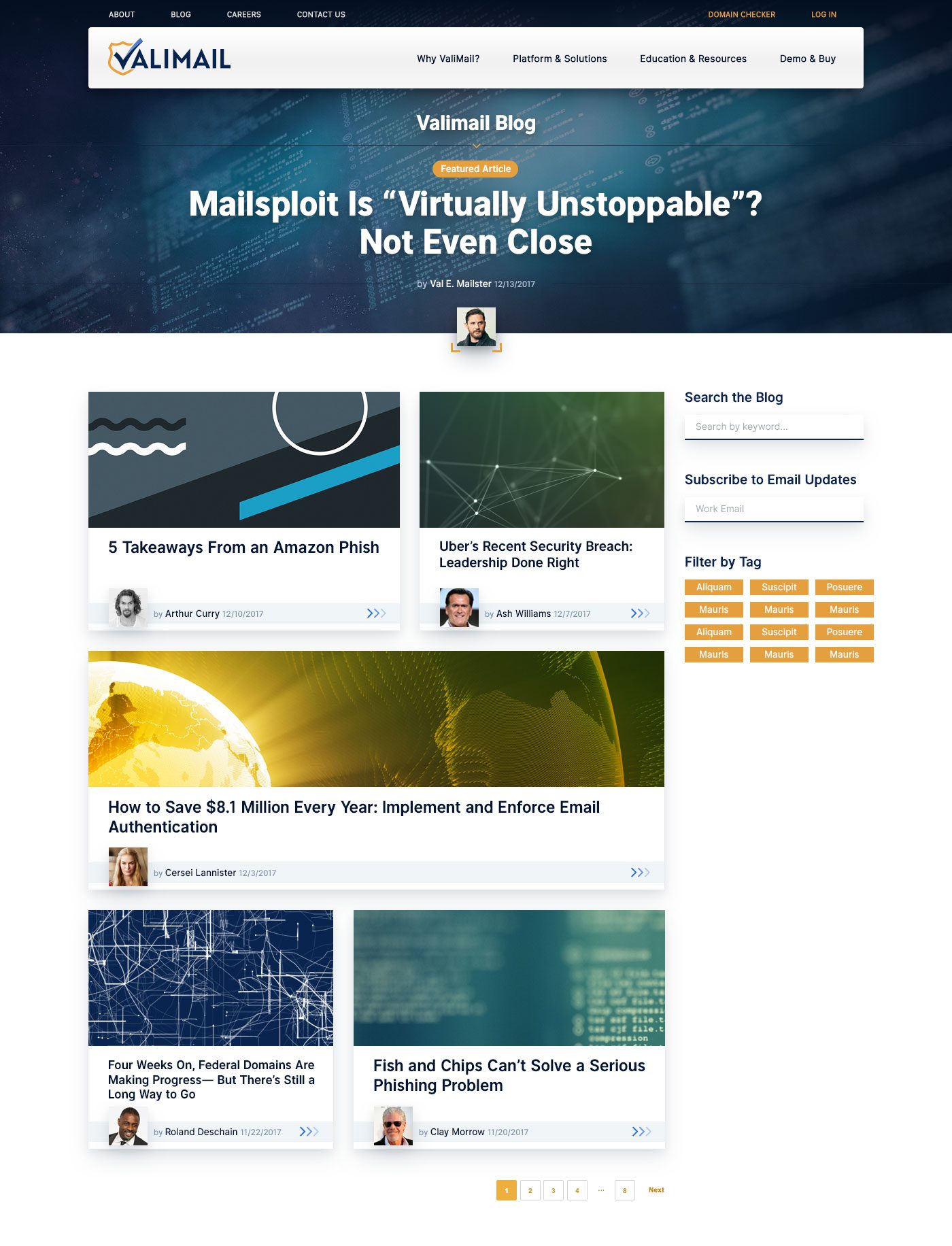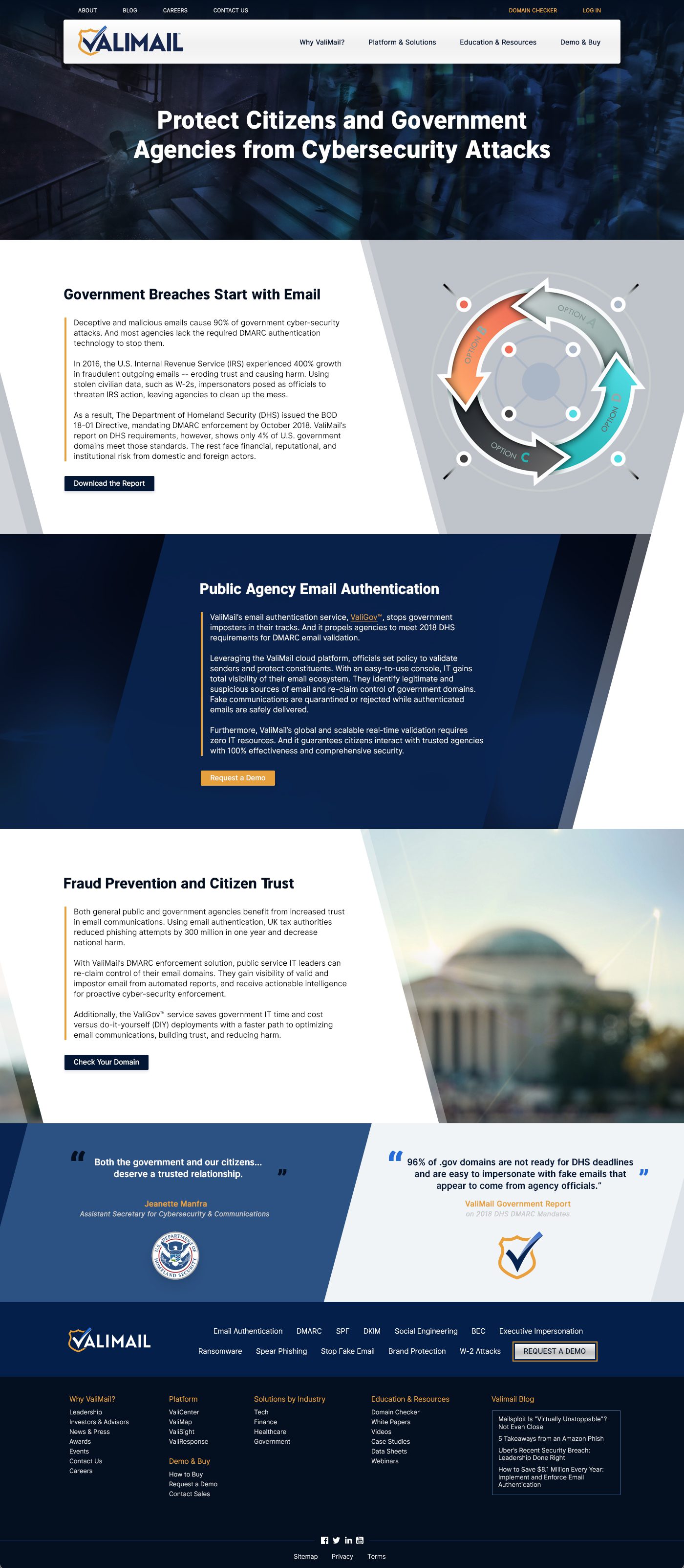 Valimail needed a more professional looking website that communicated not only how big their company is, but how far-reaching DMARC enforcement is. We opted for a story based homepage full of animations showing communication lines around the globe. As you scroll down the page, information either comes into focus or fades out as you progress through the information. The subpages hinted at the global reach within their abstract headers while the information down the page zig-zagged through diagonals that hinted at the diagonals in the V, A’s and M within the logo.