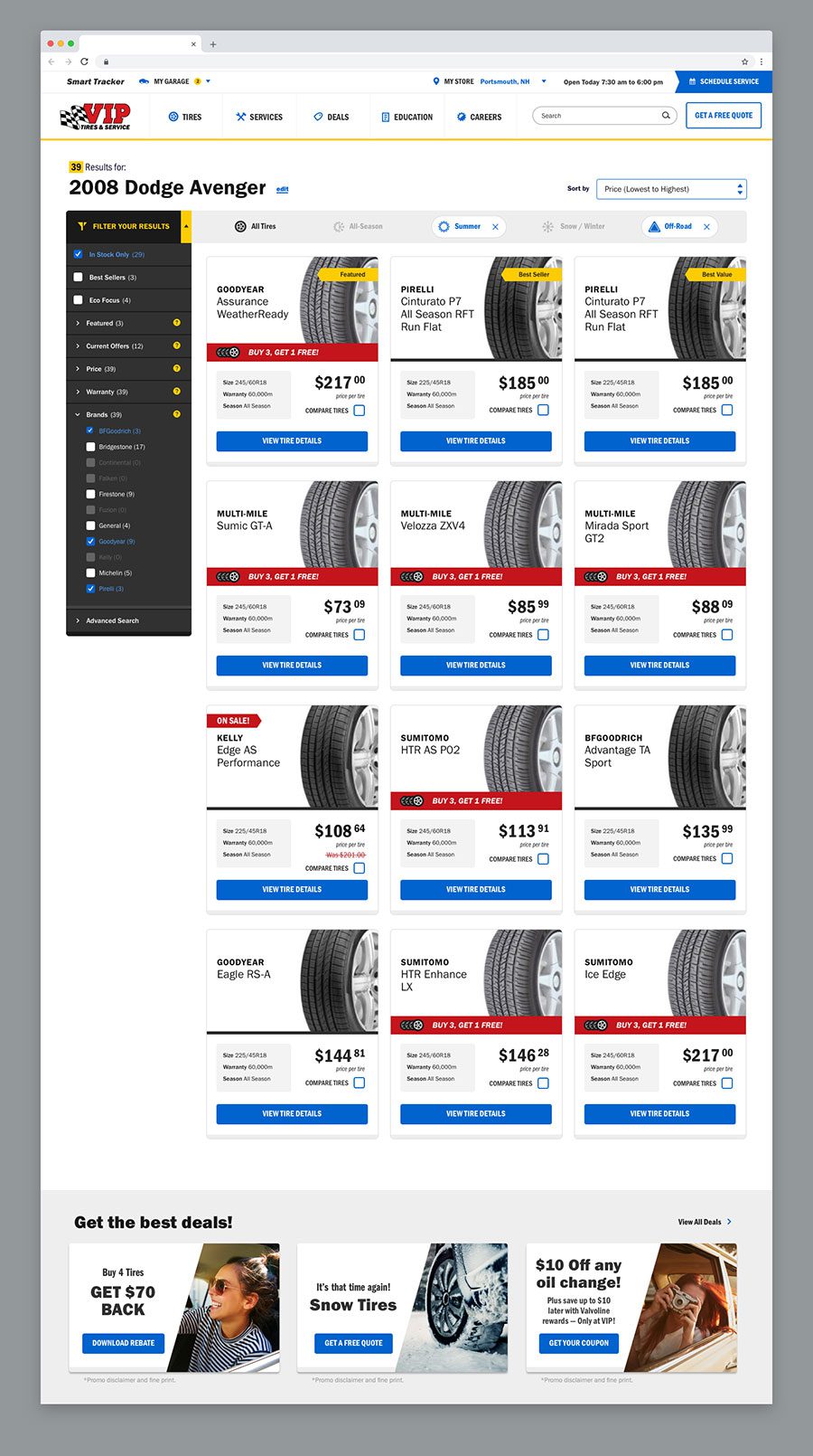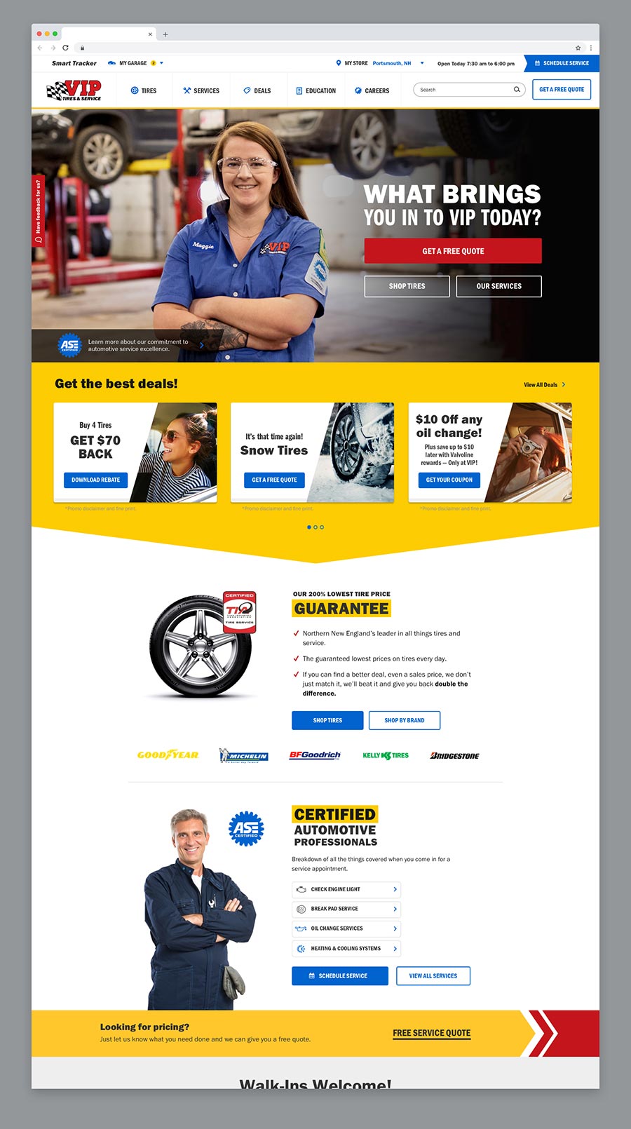 VIP needed a full eCommerce facelift. This was a large build with thousands of products split across many different locations in New England. Their products included tires as well as individual services. The biggest challenge in this build was to figure out seamless logic from product search to final order. The process included tire search, warehouse availability, pay at store vs. pay online, appointment scheduling, and appointment reminders.